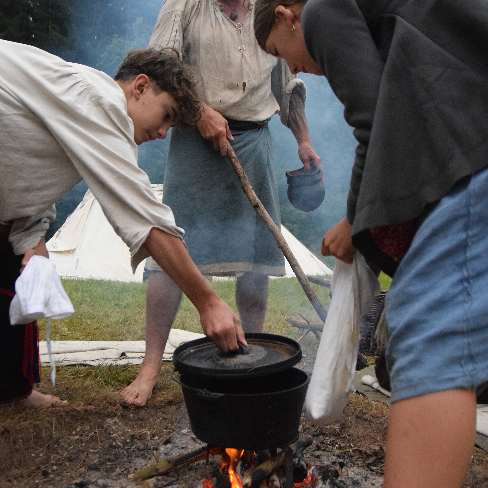 Táboření patří k velmi důležitému segmentu našeho programu. Je to ten nejryzejší kontakt s přírodou, který můžeme praktikovat. Kulisy přírodní kultury jsou naší metodou ověřování si technologických postupů v praxi. Naše keramika pro vaření v ohni není dekorativní, slouží k uvaření jídla. Bereme si sebou pouze suroviny, které nejsou průmyslově vyrobené. Mouka ze mlýna ve lněném pytli, marmelády v hliněných zásobnicích, suché plody a čaj v březových nádobách, ovoce a zelenina v koši, maso v hrnci, voda v tykvích apod. Neprodukujeme tedy žádný odpad, slupky ze zeleniny skončí v biojámě. Učíme se tak plně využívat zdroje, aniž bychom zatěžovali přírodu. Oblečení testované v reálných podmínkách prokazuje svoji funkčnost, případně, kde je třeba co upravit. Tradičním programem je lukostřelba, bubnování a tance, různé hry a průzkumy lesa. Každý člověk se v lese přirozeně ztiší, což mu umožní lépe vnímat život kolem sebe. Sledujeme letecký provoz, stopy a brlohy zvířat, život ve vodě atd. Oblíbené jsou noční náslechy různých druhů sov. O tábořeních by se dalo psát donekonečna, mnohem lepší je jej ale zažít.